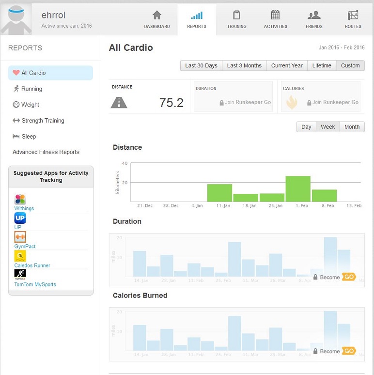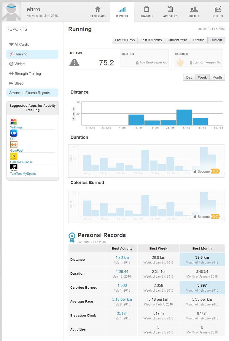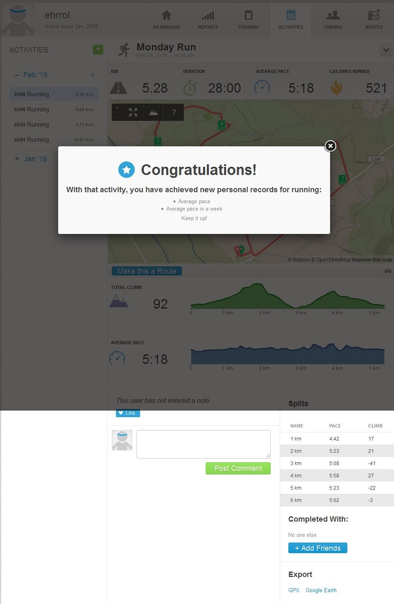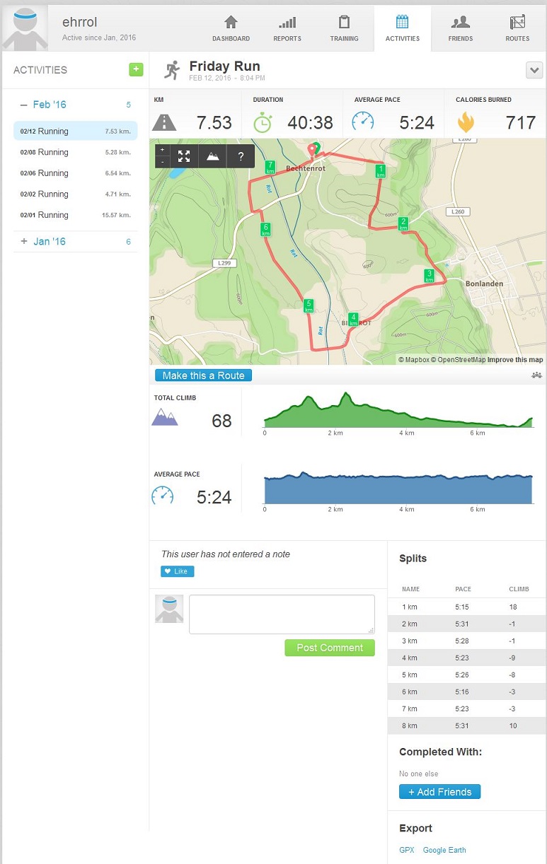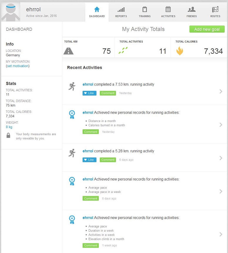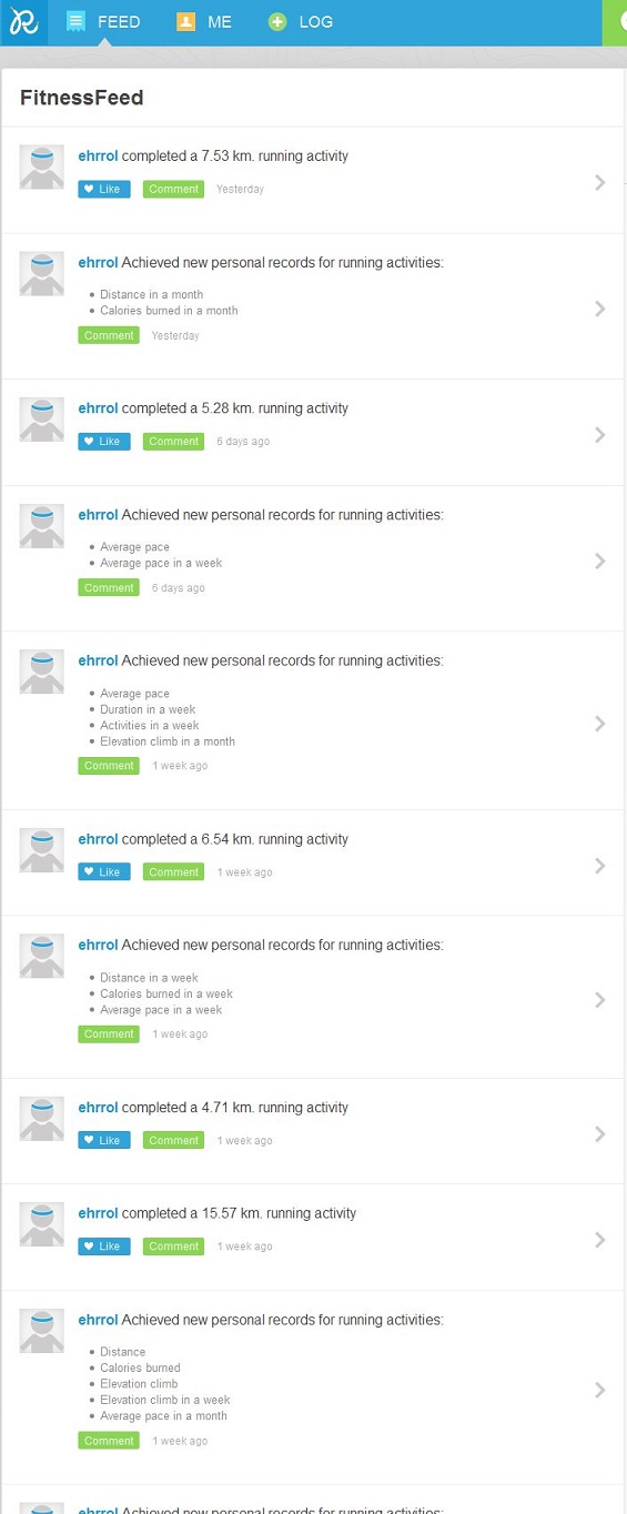 Runkeeper zeigt im Feed die aktuellen Ereignisse an, das sind neu hochgeladene Sportdaten und wenn Verbesserungen erfolgten, werden neue persönliche Rekorde gepostet.